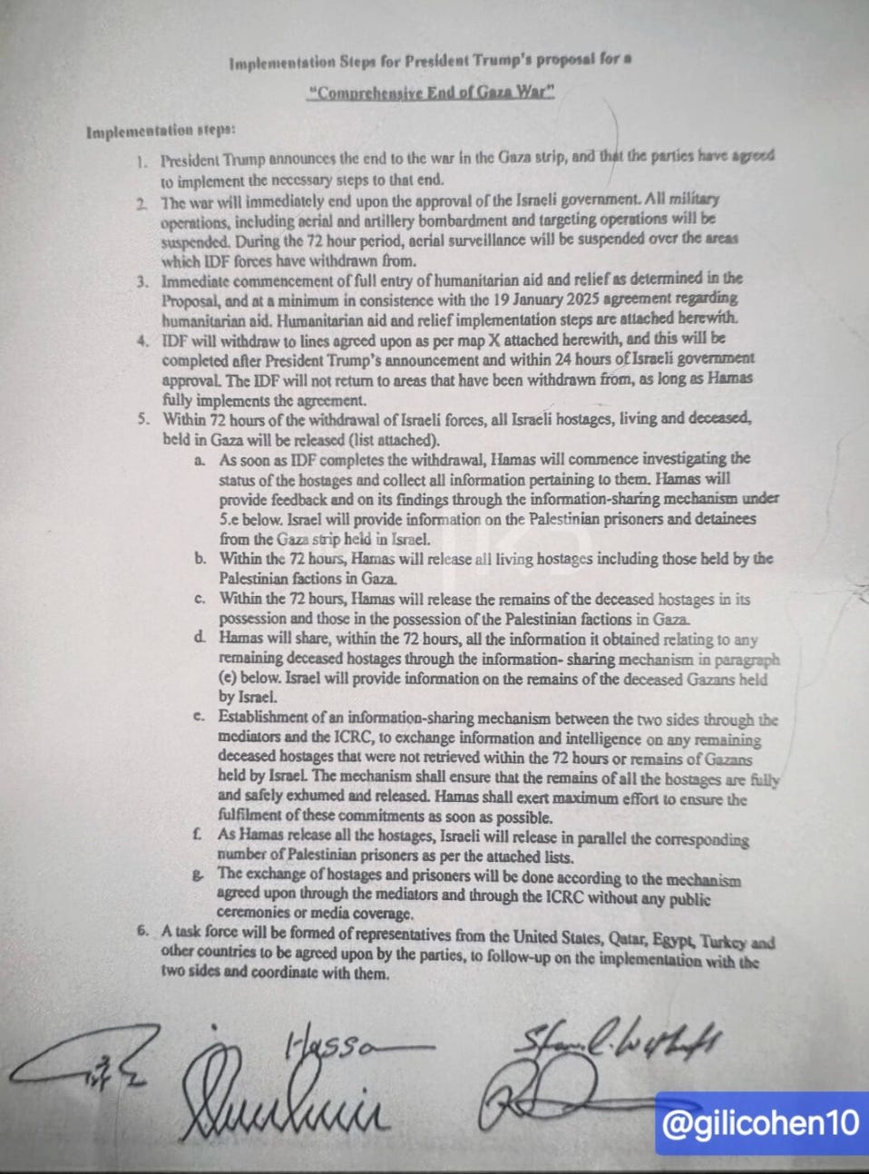 ۱. خلع سلاح کامل حماس، شامل نابودی سلاحهای باقیمانده، برچیدن تأسیسات تولید و از رده خارج کردن دائمی زیرساختهای نظامی. حماس در پاسخ ۳ اکتبر خود هیچ تعهدی به خلع سلاح نداد و صریحاً اعلام کرد که تا زمان تأسیس دولت فلسطین خلع سلاح نخواهد شد. اسرائیل خلع سلاح را کاملاً غیرقابل مذاکره میداند.